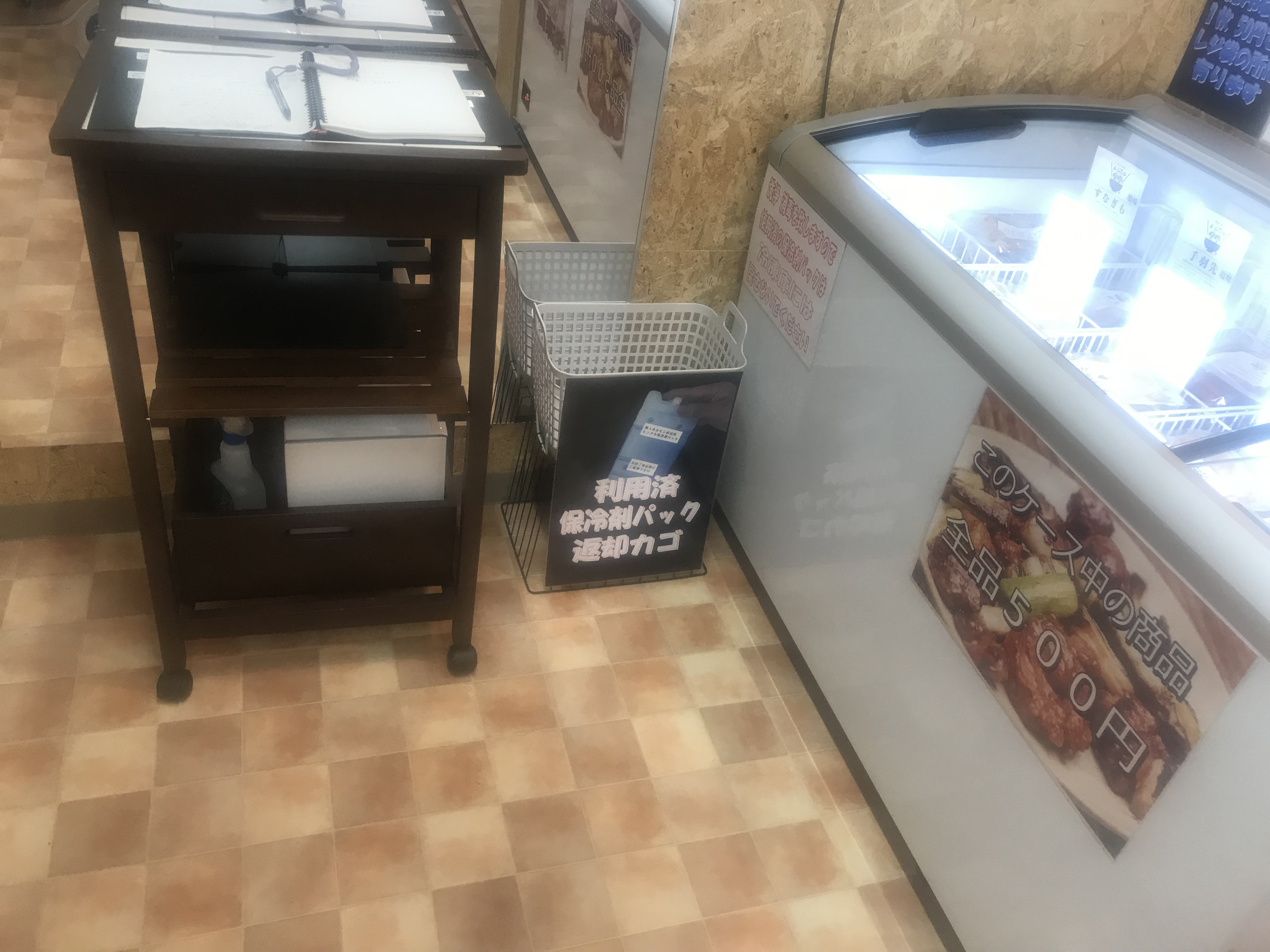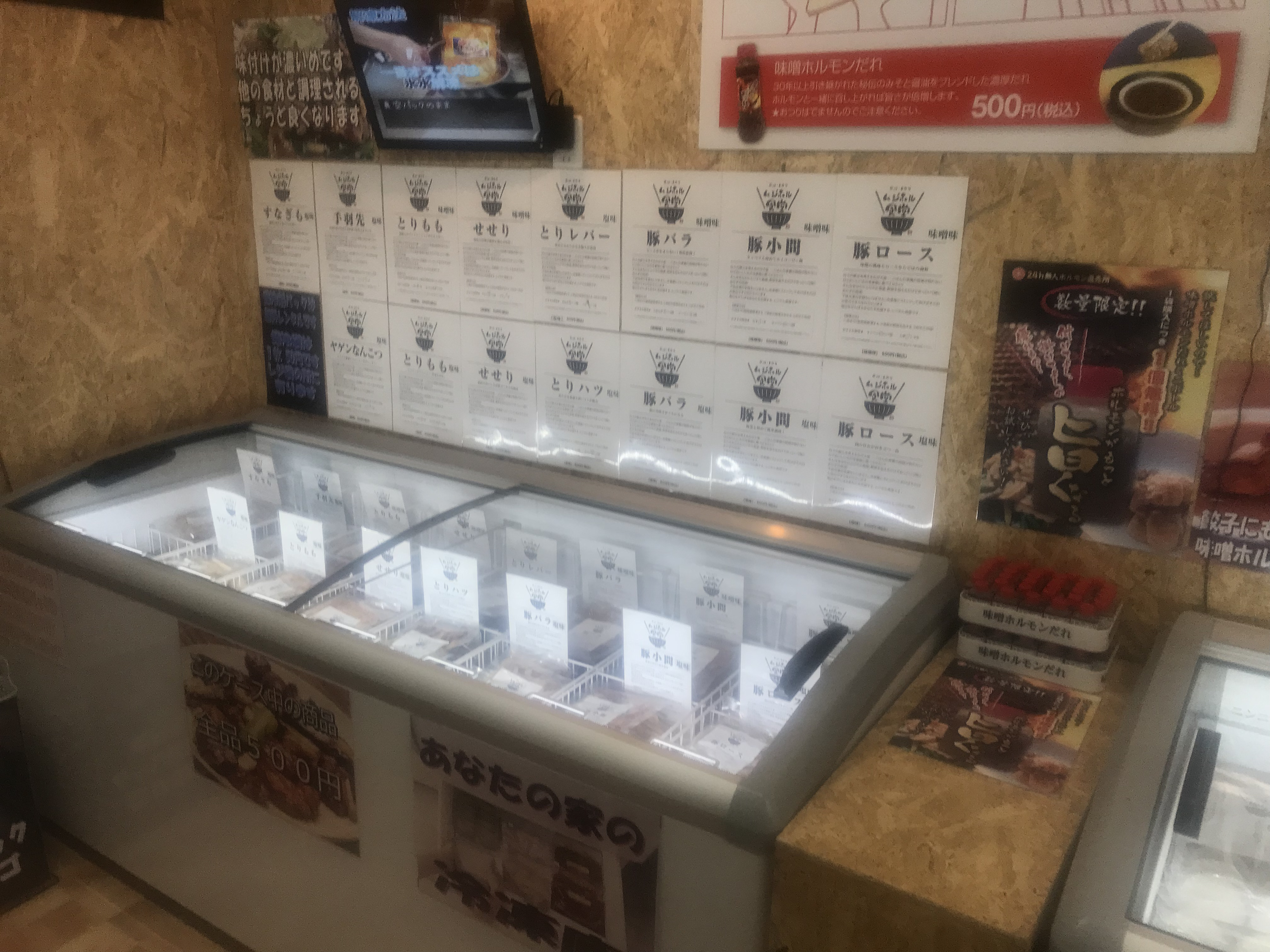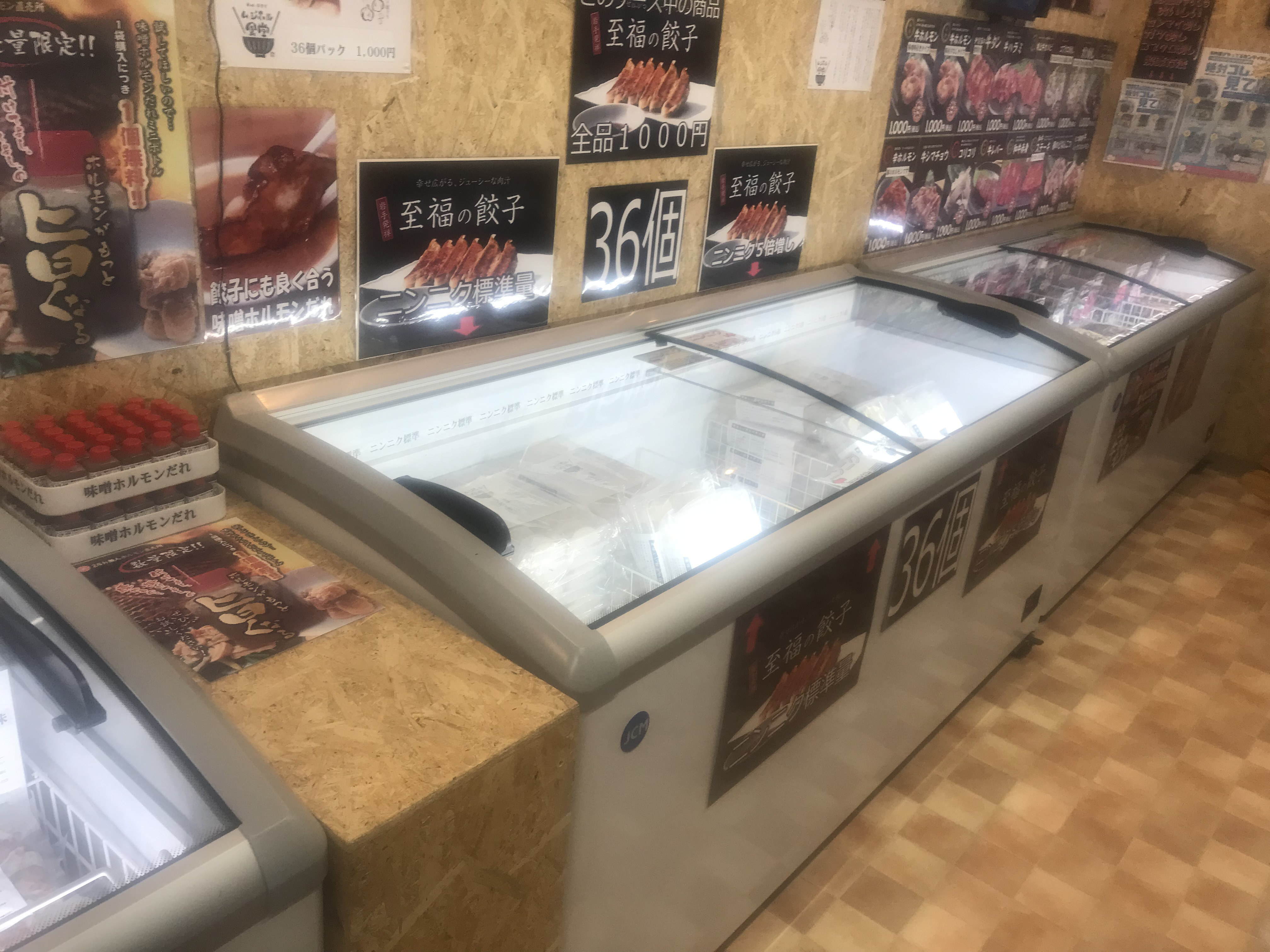 入って正面と右側にそれぞれ餃子とホルモンが入った冷凍庫を配置しております。